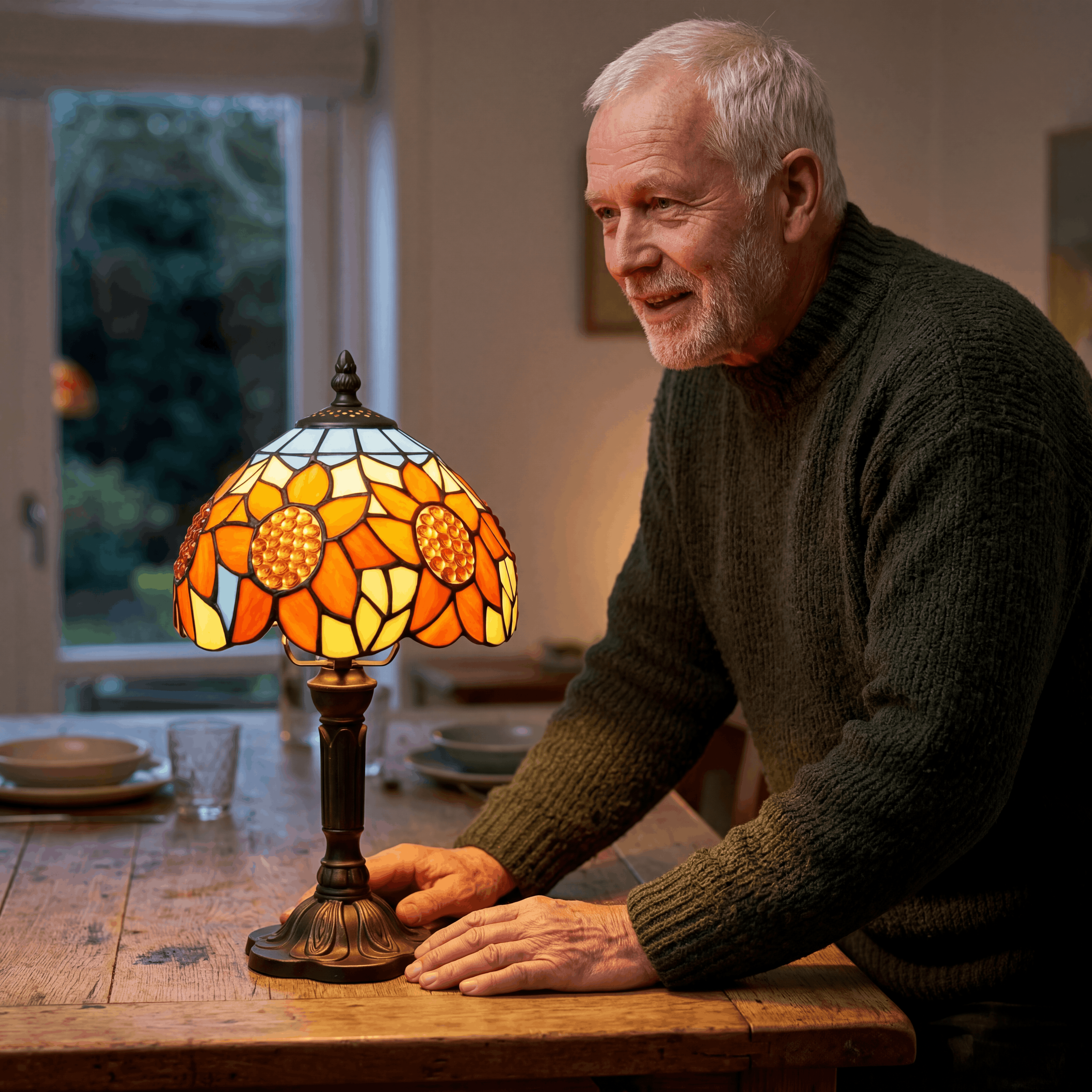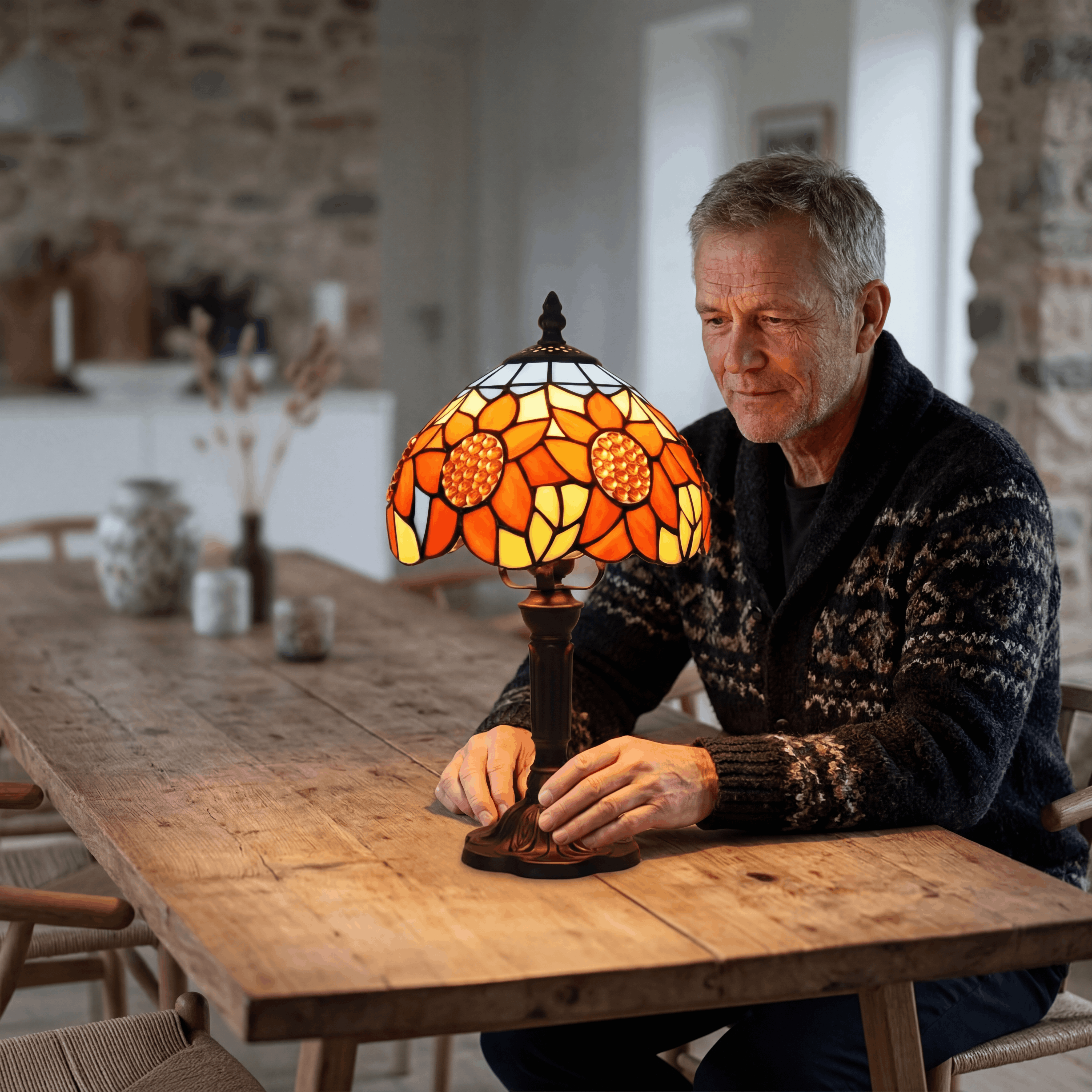 "Solsikkelampen er fuld af varme og charme. Når lyset er tændt, kommer farverne virkelig til live, og den skaber en hyggelig atmosfære i hele rummet. Den ser både klassisk og unik ud, og jeg er meget glad for mit køb."